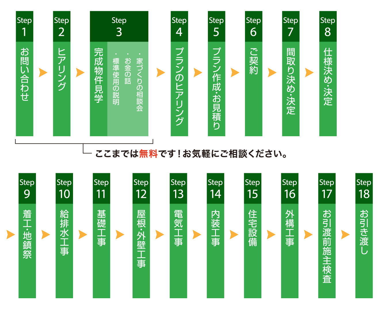 お客様にとって、一緒に家づくりを進めていく会社選びは、理想の家を完成させる“パートナー選び”です。お客様と一緒にマイホームづくりをお手伝いする気持ちを大切にし、コミュニケーションの調和をはかっております。まずは担当者よりしっかりとお客様の家づくりに対する想いを聞かせていただきます。